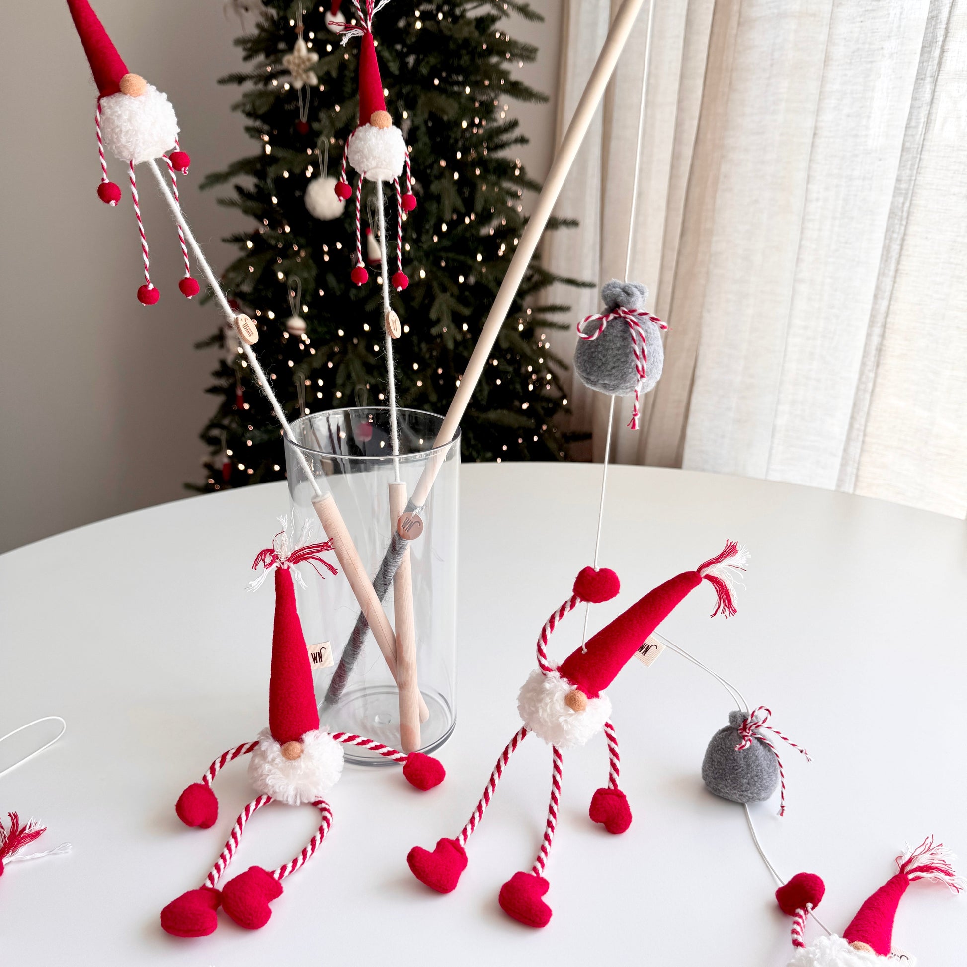 The Gnome Rod features a soft felt gnome—complete with a tall pointed hat and fluffy white beard—attached to a lightweight wooden rod with a gentle string for playful movement. Perfect for swatting, chasing, and adding a touch of seasonal magic to playtime.