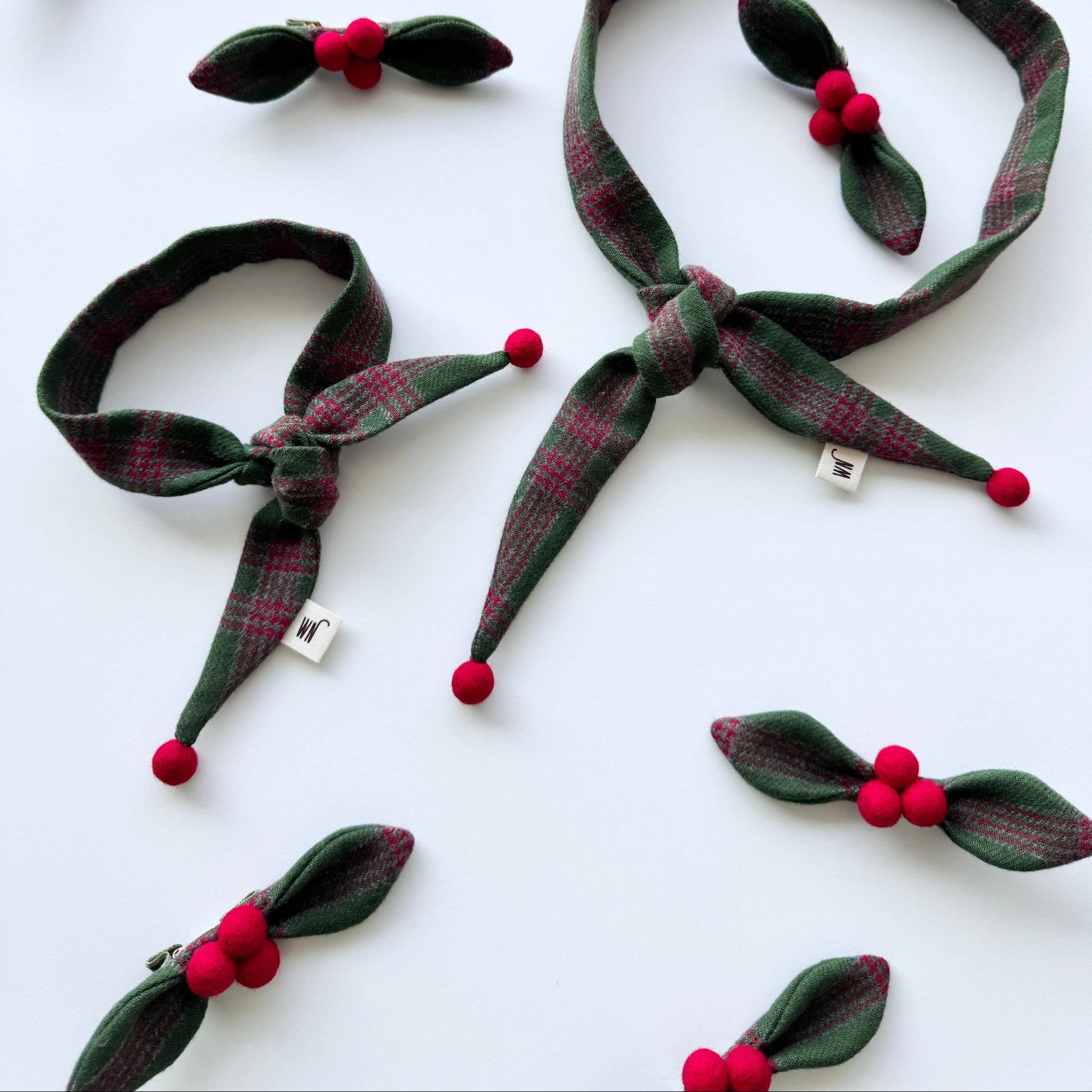 The Holy Hair Clip features a soft felt holly leaf with bright red berries, crafted in miniature size for an effortless, lightweight fit. Perfect for quick holiday photos, cozy winter outfits, or pairing with your seasonal headpieces and scarves.