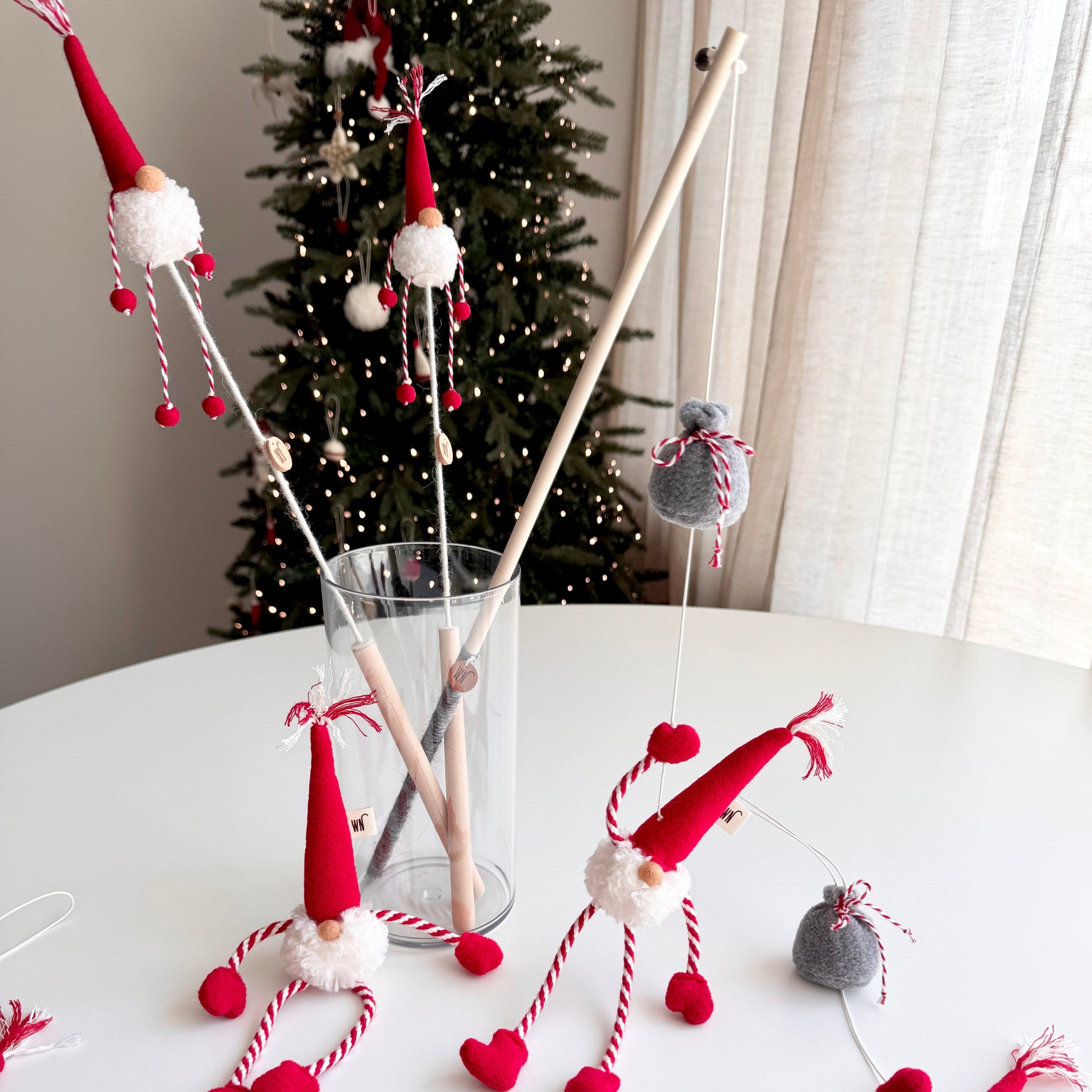 The Tiny Gnome Wand features a miniature felt gnome—complete with a tall pointed hat and soft beard—attached to a lightweight wooden rod. Designed for playful swats and flicks, it brings a touch of holiday magic to every moment.